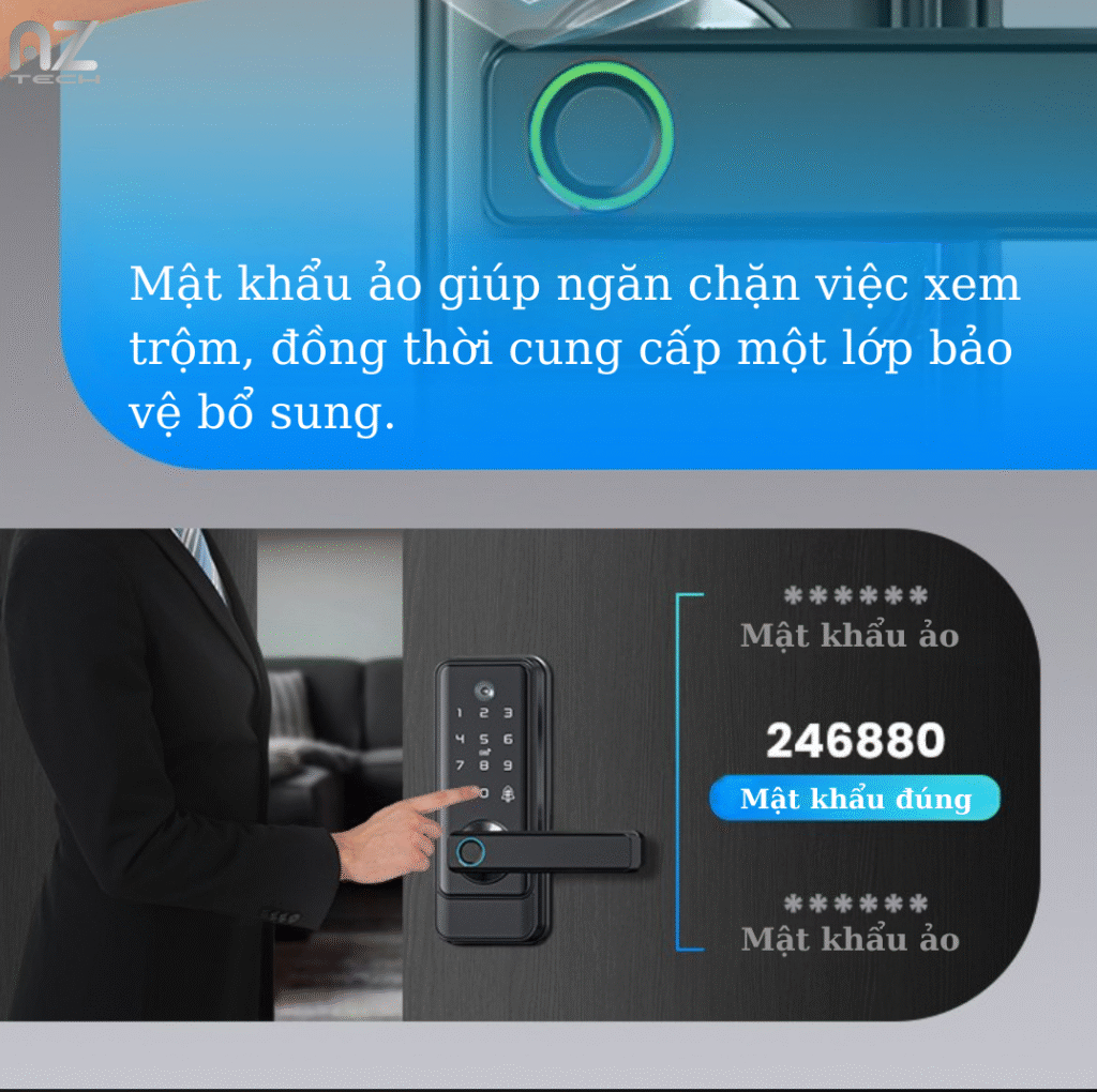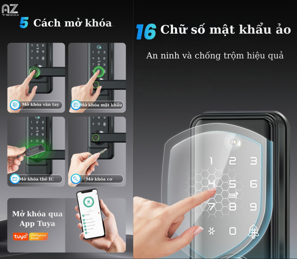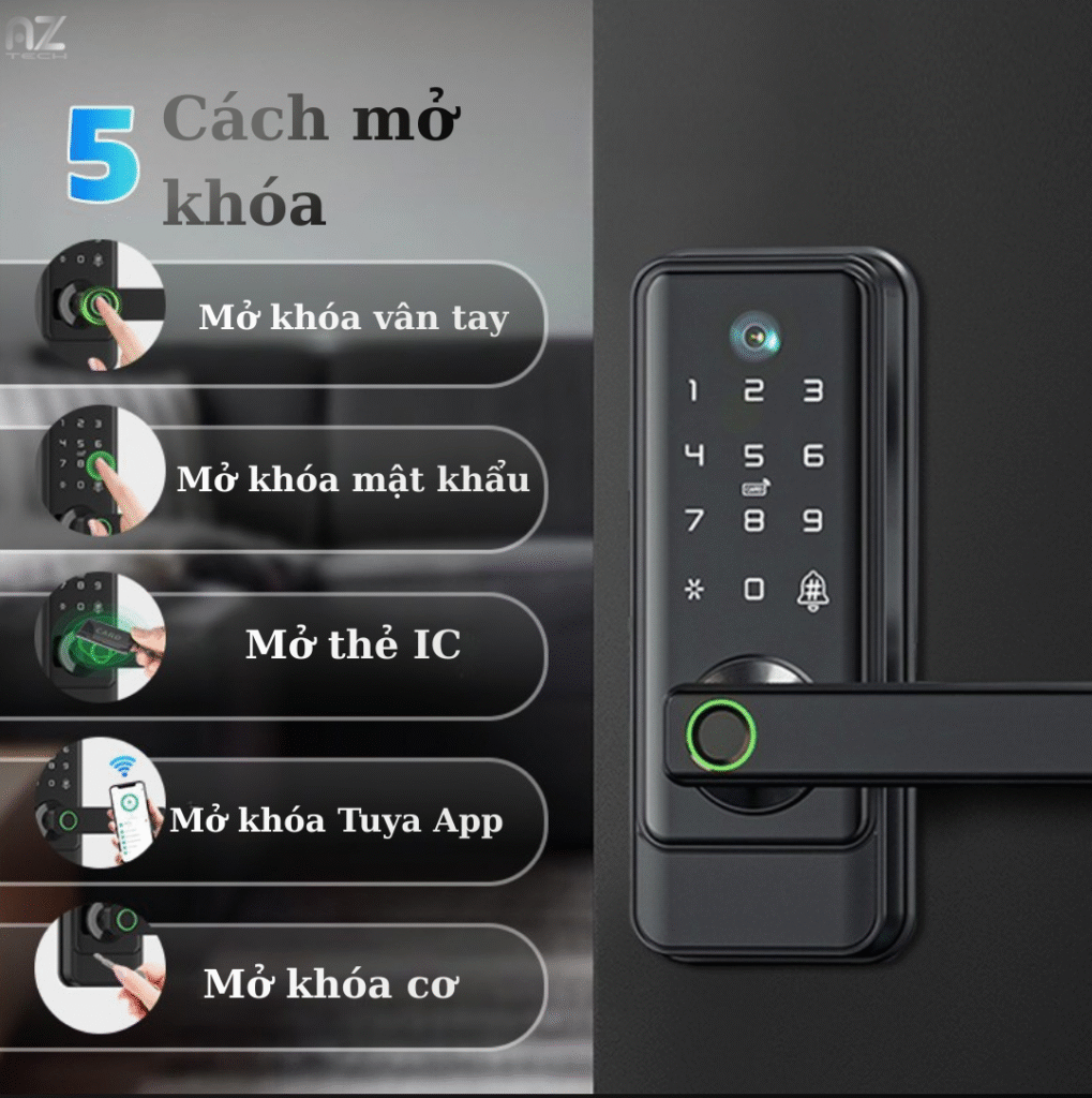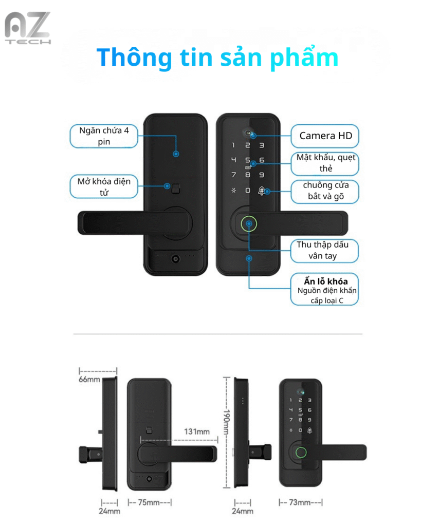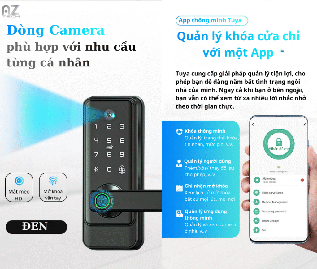 | Tính năng thông minh | Mở khóa từ xa, Quản lý và phân quyền người dùng, Camera giám sát tình hình ngoài cửa, Mật khẩu ảo |