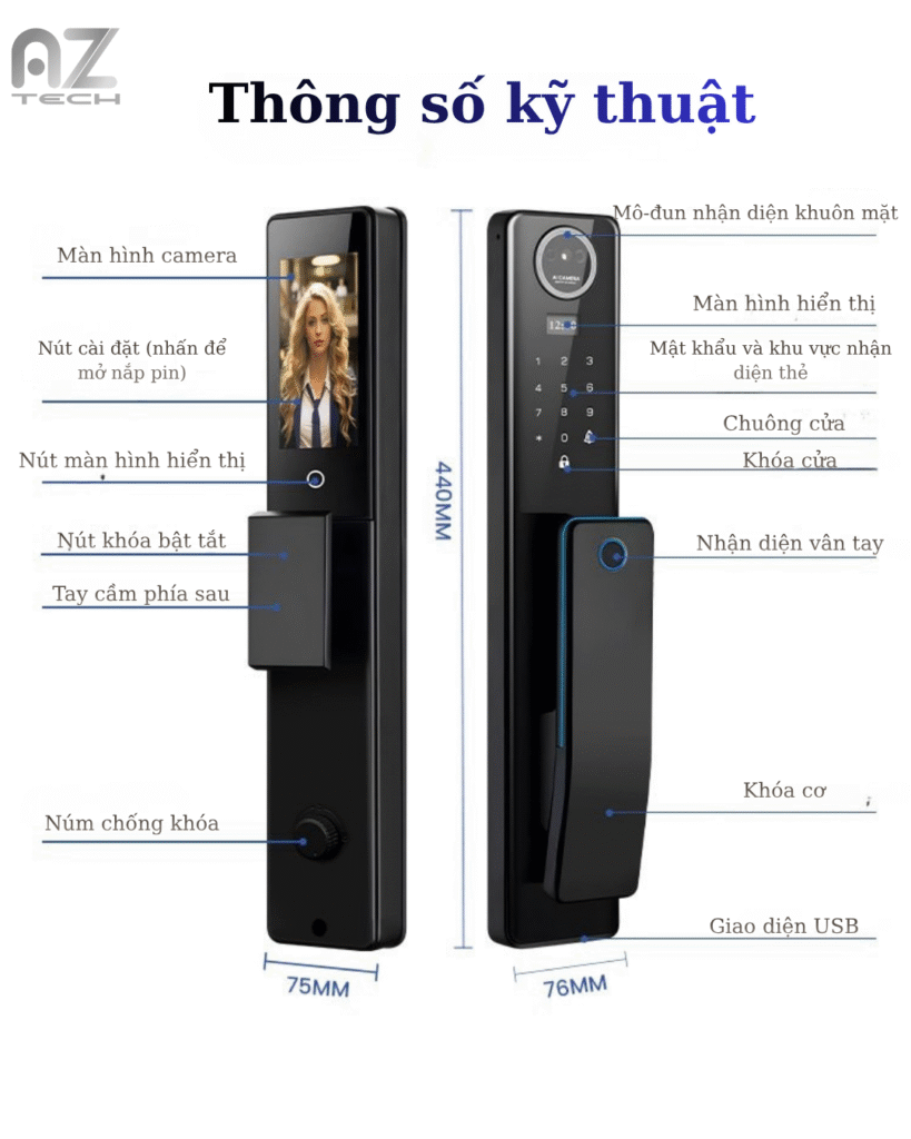 | Phương thức mở khóa | Nhận diện khuôn mặt, Nhận diện vân tay, Thẻ từ, Mật khẩu, Mở khóa từ xa qua App, Chìa khóa cơ |