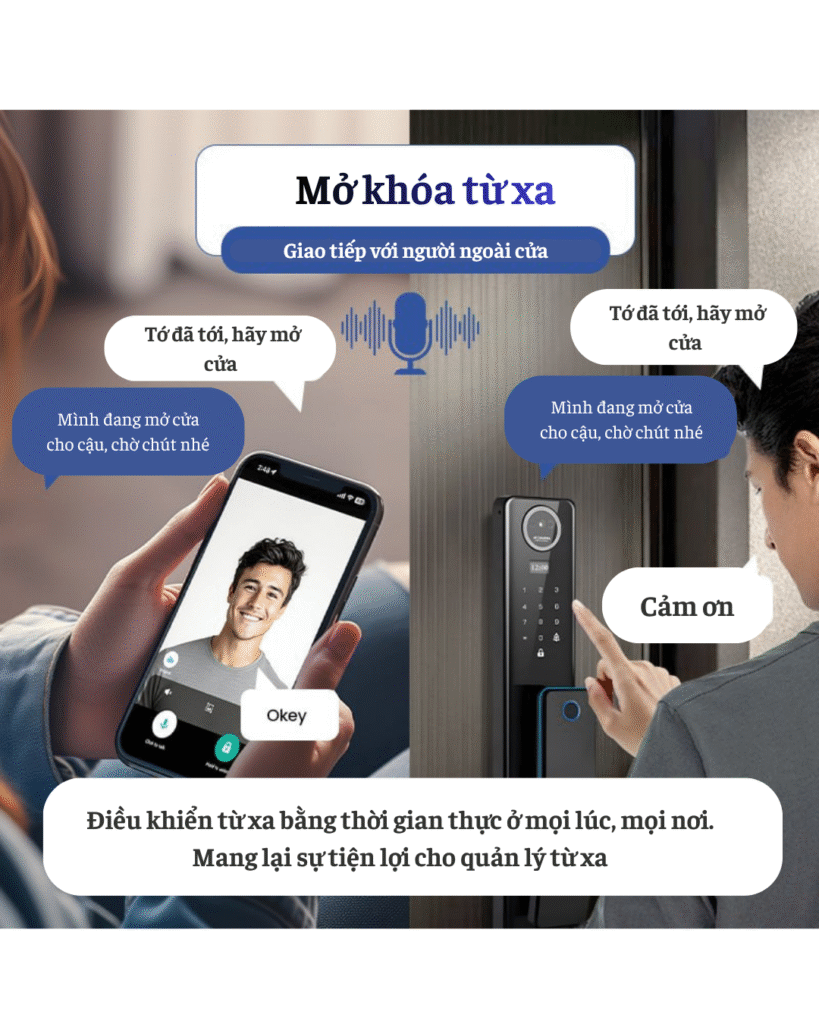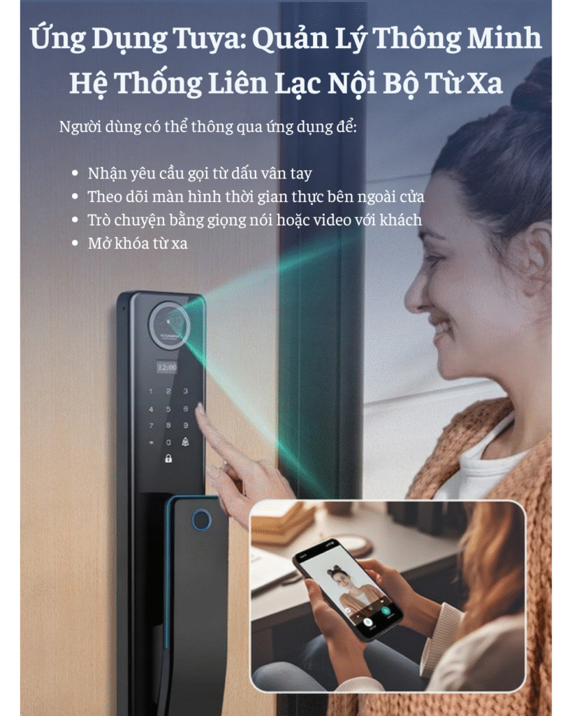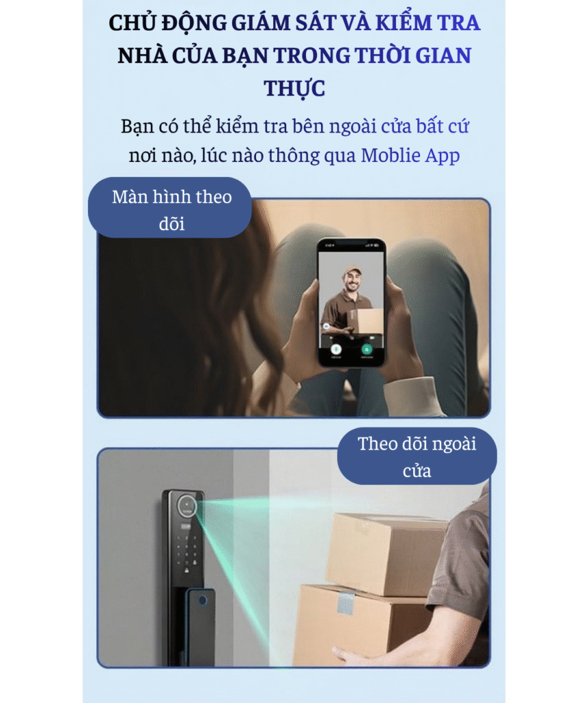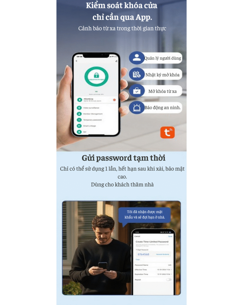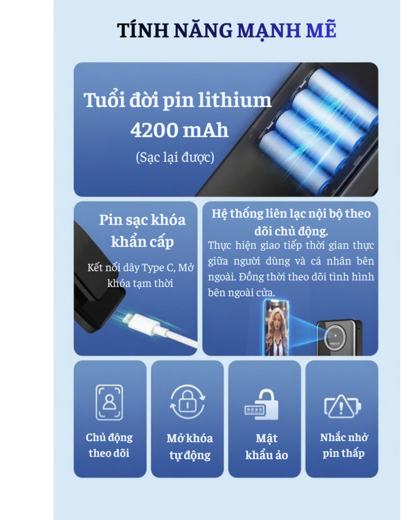 | Tính năng thông minh | Gọi video 2 chiều, Theo dõi tình hình ngoài cửa, Quản lý và phân quyền người dùng, Mở khóa từ xa, Báo động, Nhật ký mở cửa, Cảnh báo pin thấp, Password tạm thời |