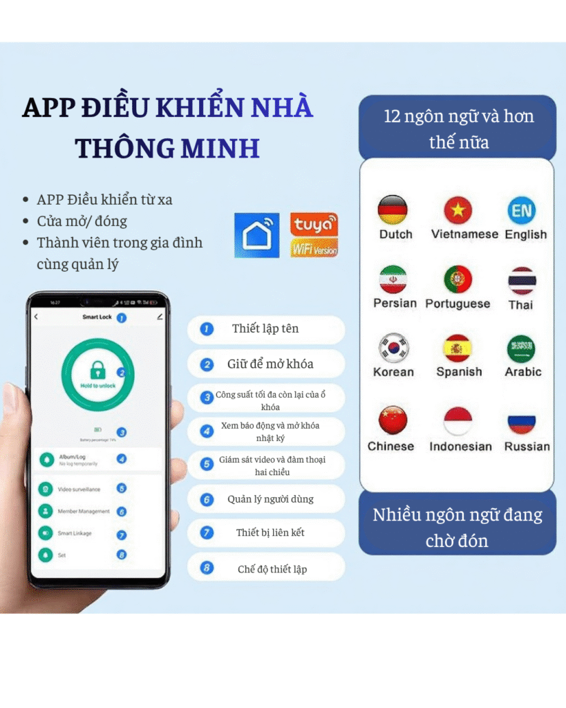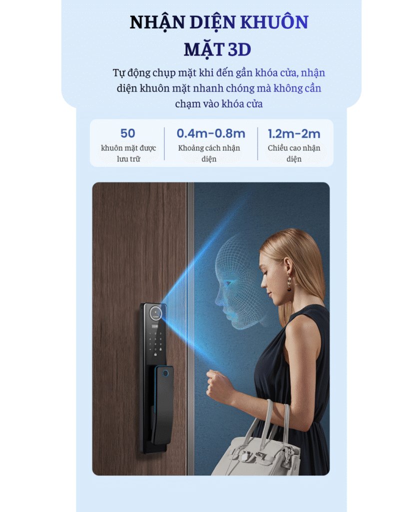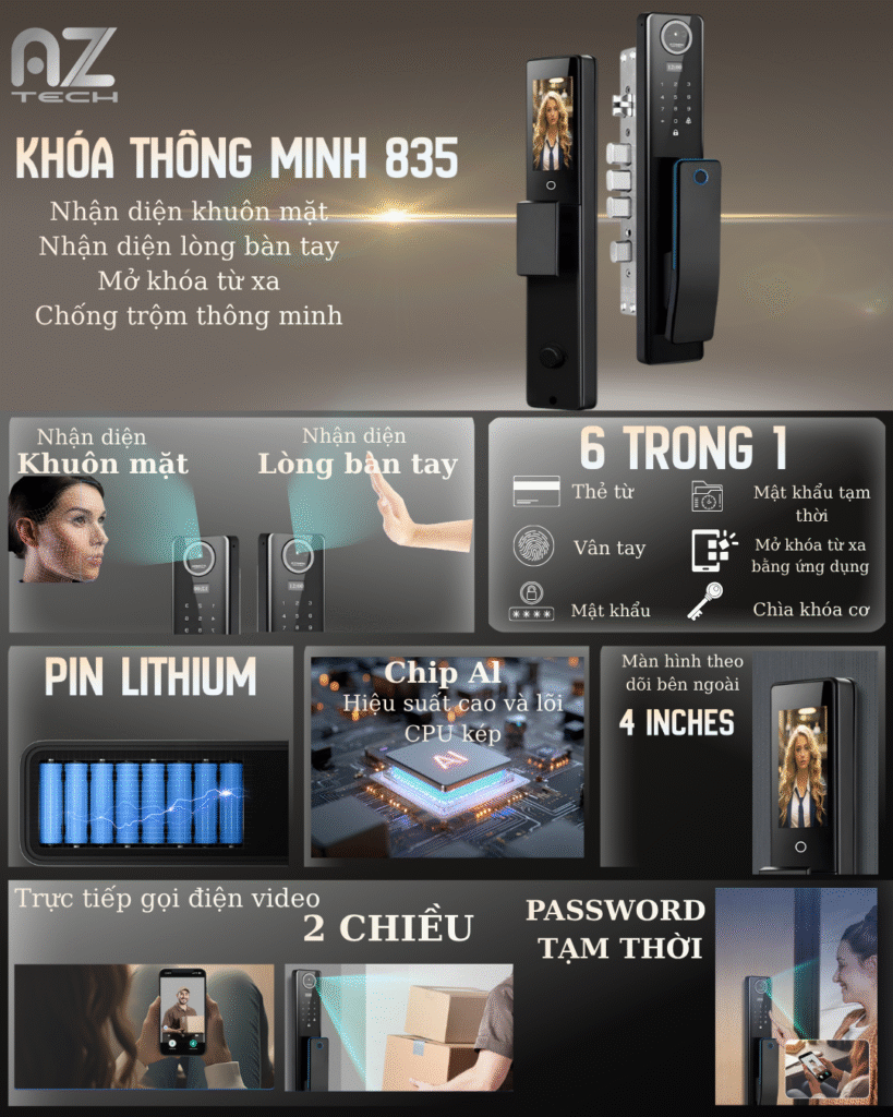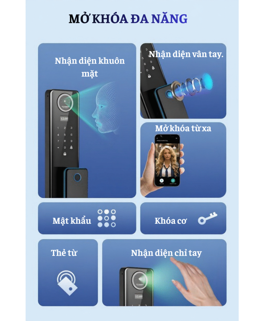 | Phương thức mở khóa | Nhận diện khuôn mặt, Nhận diện vân tay, Thẻ từ, Mật khẩu, Mở khóa từ xa qua App, Chìa khóa cơ |